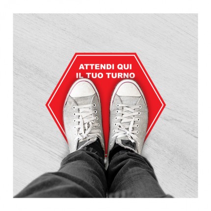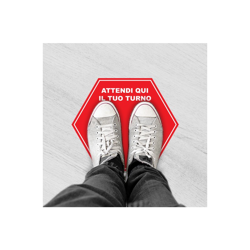 - n. 6 Adesivi Segnaletici Calpestabili esagonali "Attendi qui il tuo turno" dimensioni 30x30 cm