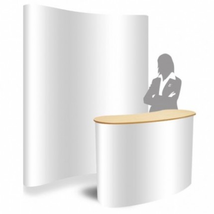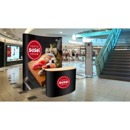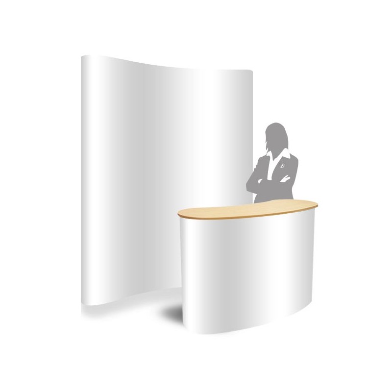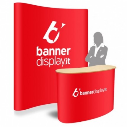 Il kit è composto dal Pop Up 2x3 curvo monofacciale corredato di stampa grafica su PVC espanso 300 micron con lamina per protezione della stampa durante la rapida fase di montaggio e smontaggio e un banchetto pubblicitario Desk Pop.